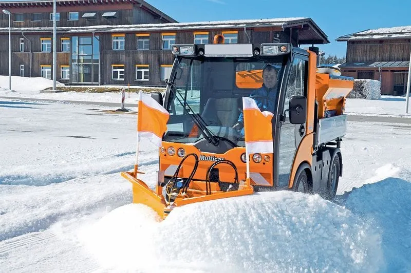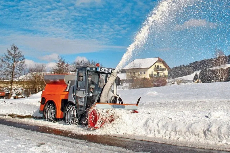 Zeichnet sich eine schneereichere oder auch kältere Wetterlage ab, lassen sich verschiedene Geräteträgermodelle einfach und schnell umrüsten. Anstelle der Kehrmaschine wird im vorderen Anbauraum oder am Frontlift ein Schneeschild angebracht und hinter der Kabine ein passender Streuaufbau aufgesattelt.