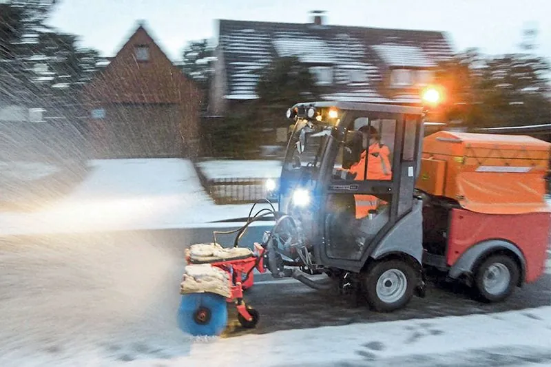 Gerade bei Minusgraden mit Bodenfrost oder bei Wechselfrostlage steigt das Risiko, dass sich der Schnee auf stark frequentierten Straßen und ­Wegen verdichtet und vereist. Eine Kehrmaschine würde diese Fläche eher glattpolieren als räumen. In diesen Situationen ist der Einsatz eines Schneepflugs in Kombination mit abstumpfenden Mitteln sinnvoll. Für mehr Sicherheit sorgen Maschinen mit Allradantrieb, denn durch die hohe Traktion geraten sie auch bei ansteigenden und abfallenden Untergründen nicht so leicht ins Rutschen. Auch größere Schneehöhen sind mit diesen Fahrzeugen effizient zu bewältigen. Da der Schnee meist nicht bis auf die Fahrbahnober­fläche entfernt wird, empfiehlt sich der parallele Einsatz von abstumpfenden oder auftauenden Streumitteln.