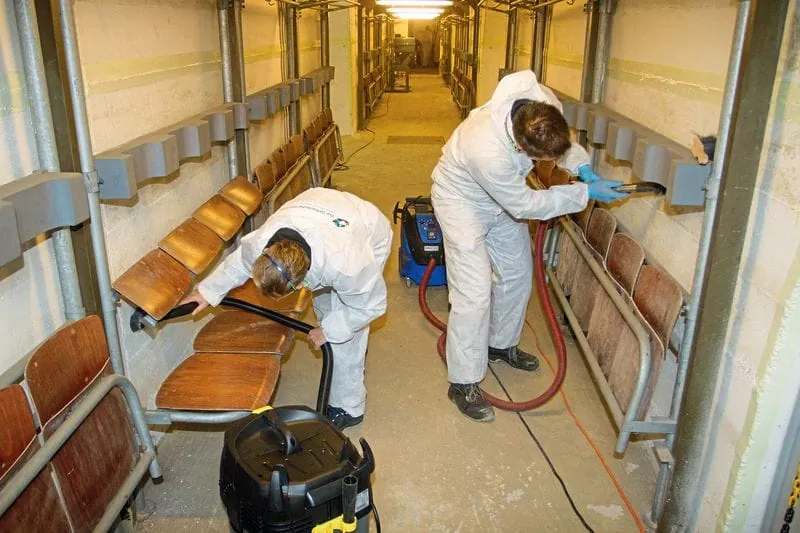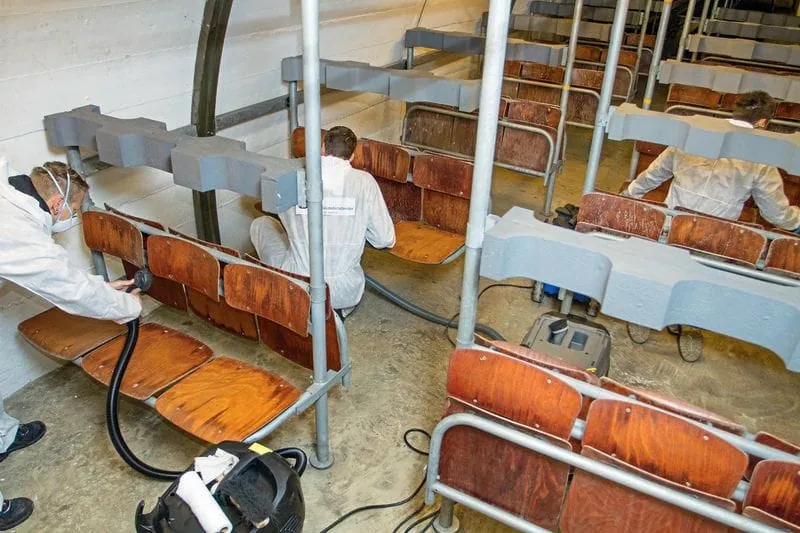 Eingesetzt wurden bei der dreitägigen Aktion der Landesinnung Mitarbeiter, die bereits Erfahrung im Bereich Sonderreinigung haben. In einem ersten Schritt wurden Staub und leicht anhaftende Verschmutzungen mit speziellen Industriesaugern und entsprechenden Filtern, zur Verfügung gestellt von Kärcher, von Wänden und Sitzflächen entfernt. Später wurden die Einrichtungen und technischen Anlagen von Ablagerungen befreit. Während der gesamten Reinigungsmaßnahmen wurde darauf geachtet, möglichst wenig Wasser einzusetzen, um ein Aufsteigen von Luftfeuchtigkeit in der Zivilschutzanlage zu vermeiden.