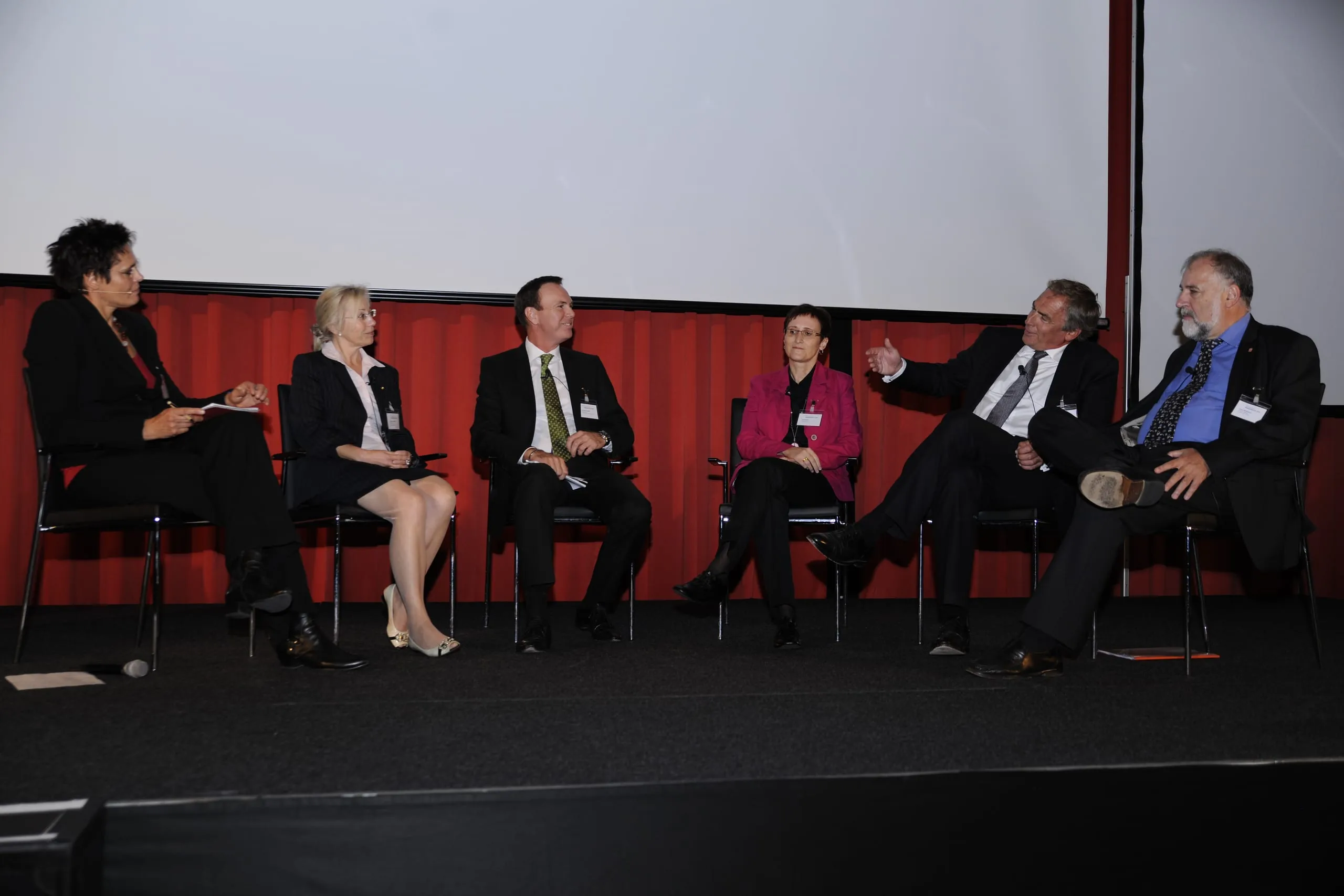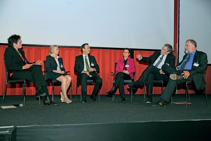 © Micha Wolfson/rationell reinigen06 Mit Moderatorin Andrea Blome (li.) diskutierten Jasmine Jost (Zentralpräsidentin Allpura - Verband Schweizer Reinigungsunternehmen), Gerhard Komarek (Berufsgruppenspecher Bundesinnung Denkmal-, Fassaden- und Gebäudereiniger Österreich), Liane Singer (Personalleiterin Zehnacker), Thomas Dietrich (stellvertretender Bundesinnungsmeister) und Klaus Wiesehügel, Bundesvorsitzender der IG Bauen-Agrar-Umwelt. -