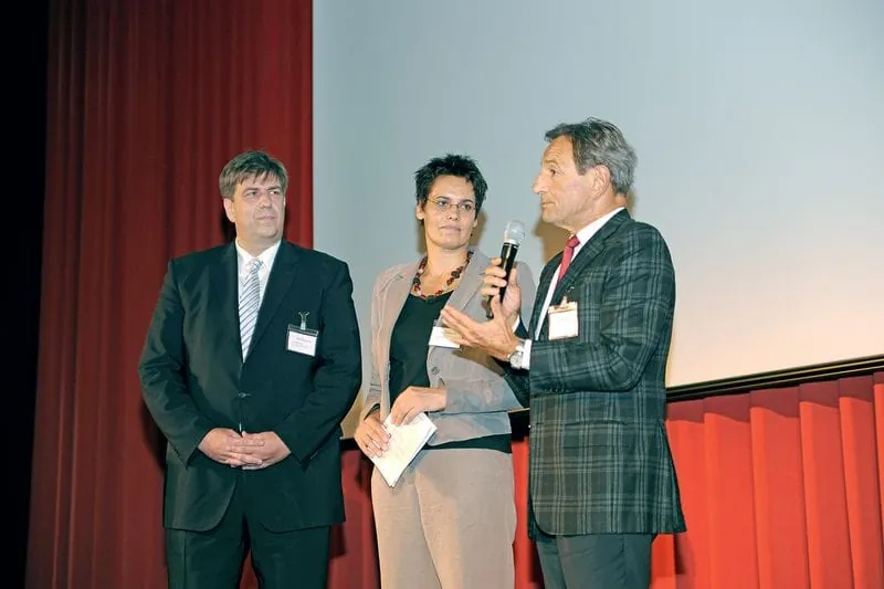© Micha Wolfson/rationell reinigen02 Die Veranstalter - hier: Jan Peter Kruse, Verlagsleiter Anzeigen, Vertrieb und Marketing bei Holzmann Medien (li.) und Bundesinnungsmeister Dieter Kuhnert mit Moderatorin Andrea Blome - zogen ein positives Resümee. -